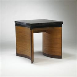 K.E.M. Weber adjustable occassional table for Disney Studios Swanson-Peterson, Company USA, 1939-40 bakelite, natural and ebonized ash 24"w x 24"d x 25.5"h A rare table form produced exclusively for the executive offices at Disney in Burbank, California. Top unfolds to 48" wide. Literature: K.E.M. Weber: The Moderne in Southern California 1920-1941, discusses the Disney commission pg. 44