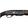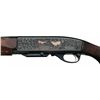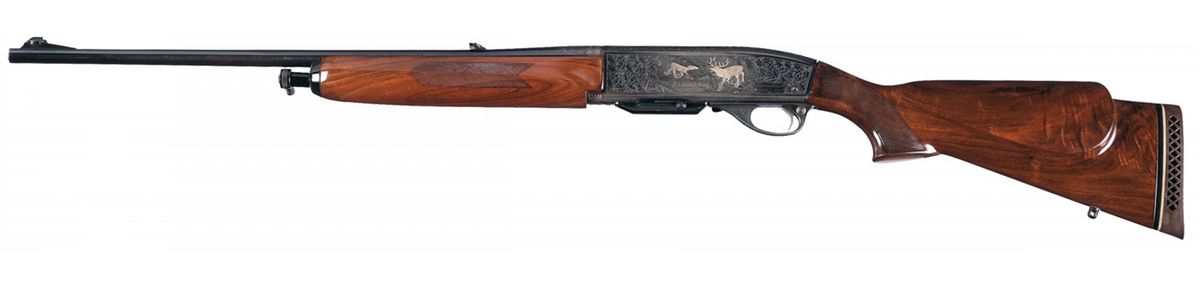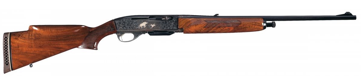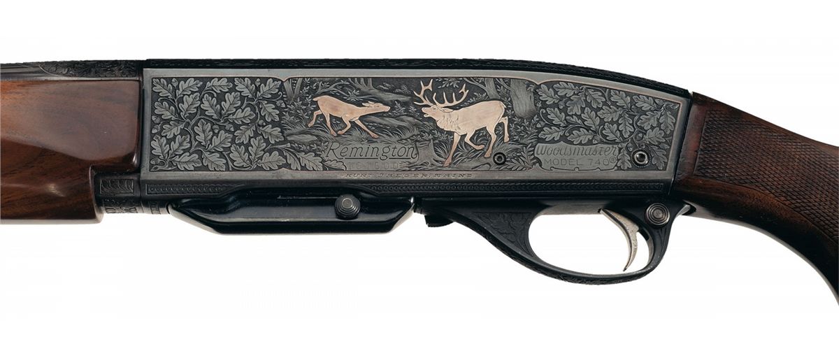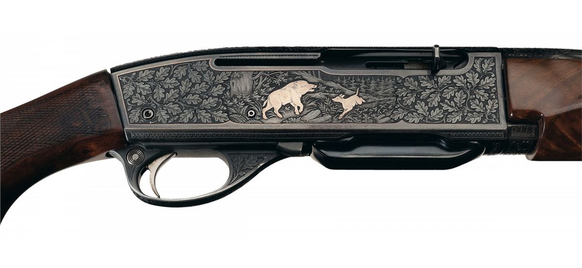 Manufactured circa 1957 and subsequently professionally embellished by Kurt Jaeger of Mainz, Germany. There is oak leaf and acorn engraving on the trigger guard, top of the receiver, breech end of the barrel and sides of the receiver framing game scenes with a silver inlaid red stag and doe in a wooded scene on the left side and a silver inlaid wild boar and dog in a wooded scene on the right side. There is silver inlay border around the outside edge of each side and a decorative pattern over the breech on the barrel. The top of the receiver is tapped for scope mounting with no screws or blocks present. Mounted on a nicely figured, checkered walnut forearm and pistol grip stock with raised rollover cheekpiece and Pachmayr White Line recoil pad.