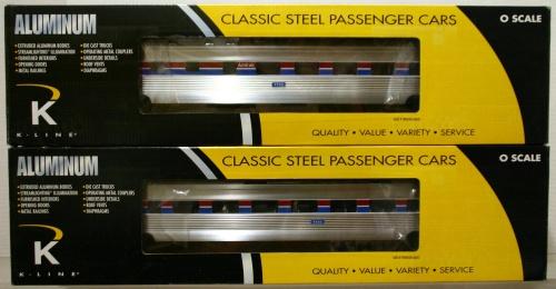 K-LINE AMTRAK HERITAGE FLEET DOME CAR, AND DINER CAR. ALUMINUM BODY, 21 INCHES LONG, LIGHTED, FIGURES IN CARS.