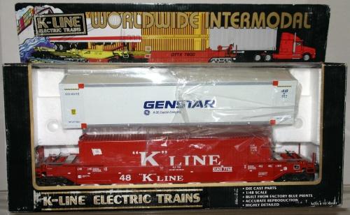 K-LINE MAXI STACK CAR W/ GENSTAR AND KLINE CONTAINERS.