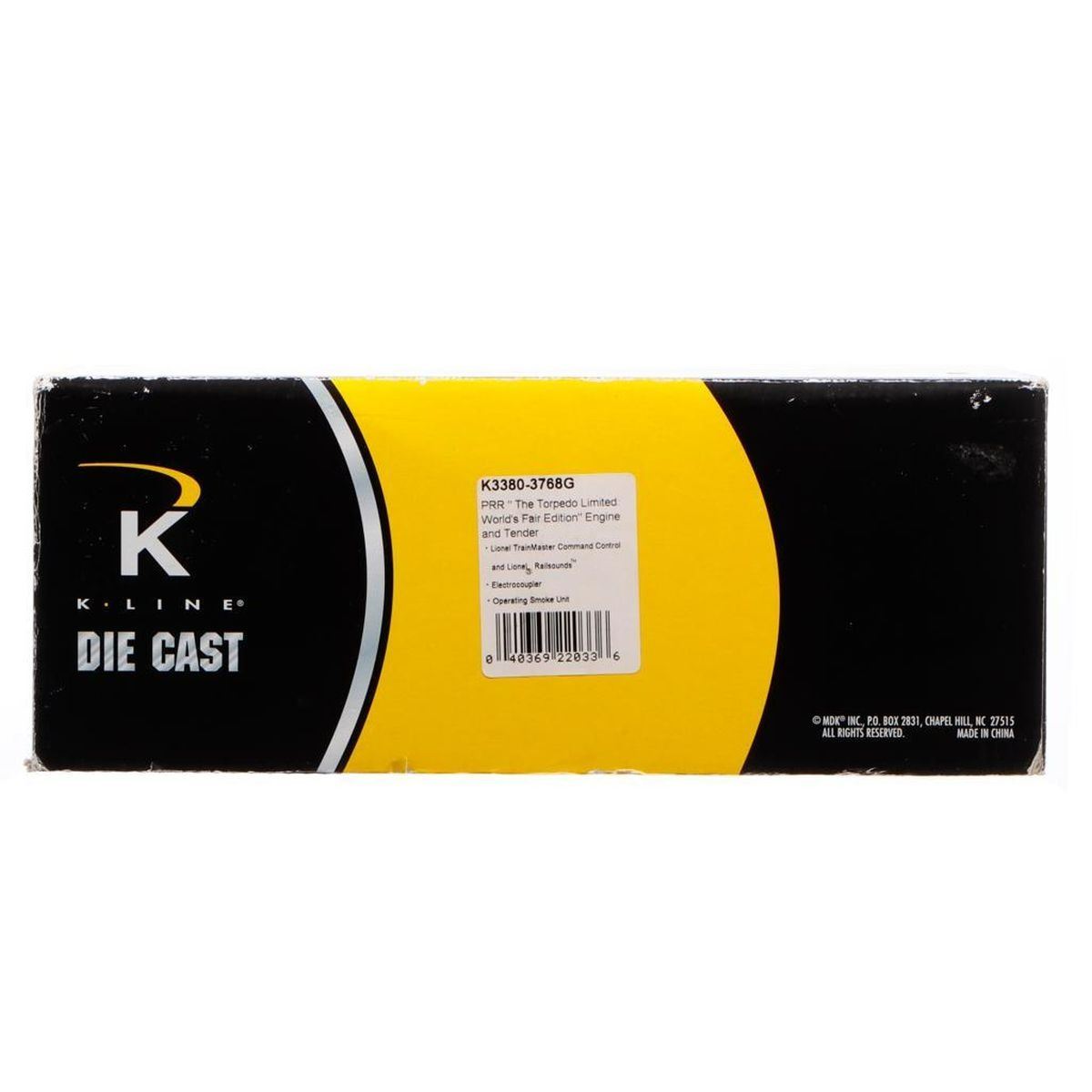 K-Line K3380-3768G O Gauge PRR "The Torpedo Limited: World's Fair Edition" Engine and Tender in original packaging.