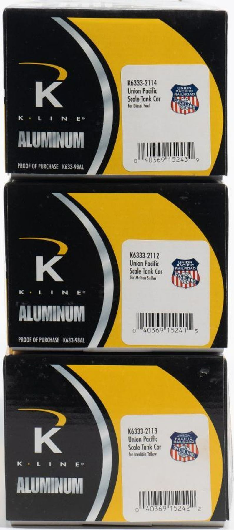 New Old Stock: K-Line O Gauge Scale Tank Car Set: K6333-2112 Union Pacific Tank Car for Molton Sulfur: K6333-2113 Union Pacific Tank Car for Inedible Tallow: K6333-2114 Union Pacific Tank Car for Diesel Fuel: