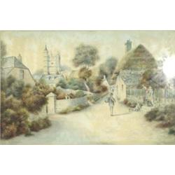 K.M. Blake, 1921 - watercolour of a village street with church, thatched cottage and women and children, 44cm x 67cm