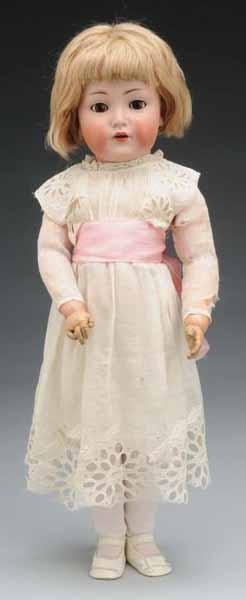Description Germany, Ca. 1910. Bisque socket head incised "K star R Simon & Halbig 117n". Flirty brown eyes, painted upper and lower eyelashes, multistroked eyebrows, open mouth with upper teeth, original bobbed mohair wig. Original K & R teenage body with rubber hands (hands are distorted, one finger missing). Vintage eyelet dress (a few holes), original cotton shift, replaced shoes and socks. Condition (Very Good). Size 21" T.