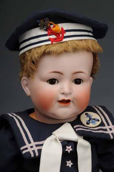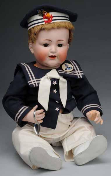 Description Germany, Ca. 1910. Bisque socket head, made by Kammer & Reinhardt, flirty brown glass eyes with real upper eyelashes, open smiling mouth with two upper teeth and tongue, dimples, original skin wig (glued tightly in back). Chubby composition baby body (wear and soil). Redressed, holding an F & B DyDee Baby spoon. Condition (Very Good). Size 26" T.
