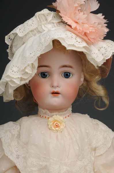 Description Germany, Ca. 1900. Bisque socket head incised "K star R", blue sleeping eyes, molded eyebrows, open mouth with teeth, pierced ears, original blonde mohair wig (glued down tightly). Original jointed composition body (light wear and soil). Beautifully dressed in cotton and lace, vintage hat and shoes, too. Condition (Excellent). Size 23" T.