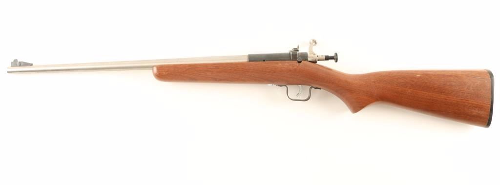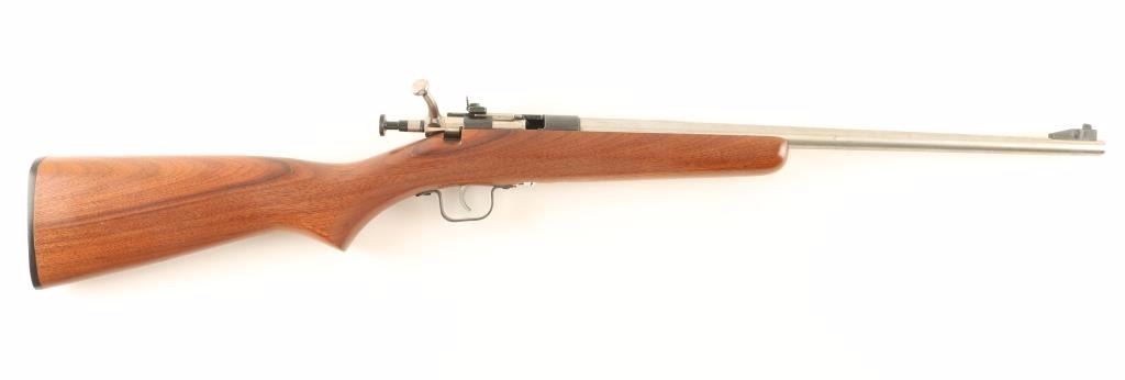 American single shot bolt action youth rifle chambered in .22 Long Rifle. Features a 16.25" stainless steel barrel, ramped blade front sight, drilled & tapped receiver, adjustable rear peep sight, integral locking safety, and smooth walnut pistol grip shoulder stock. Rifle shows very little wear with only a few light handle marks and single nick in the stock. bore is excellent and wood stock is near fine. Condition is near excellent. ***Modern Firearm***