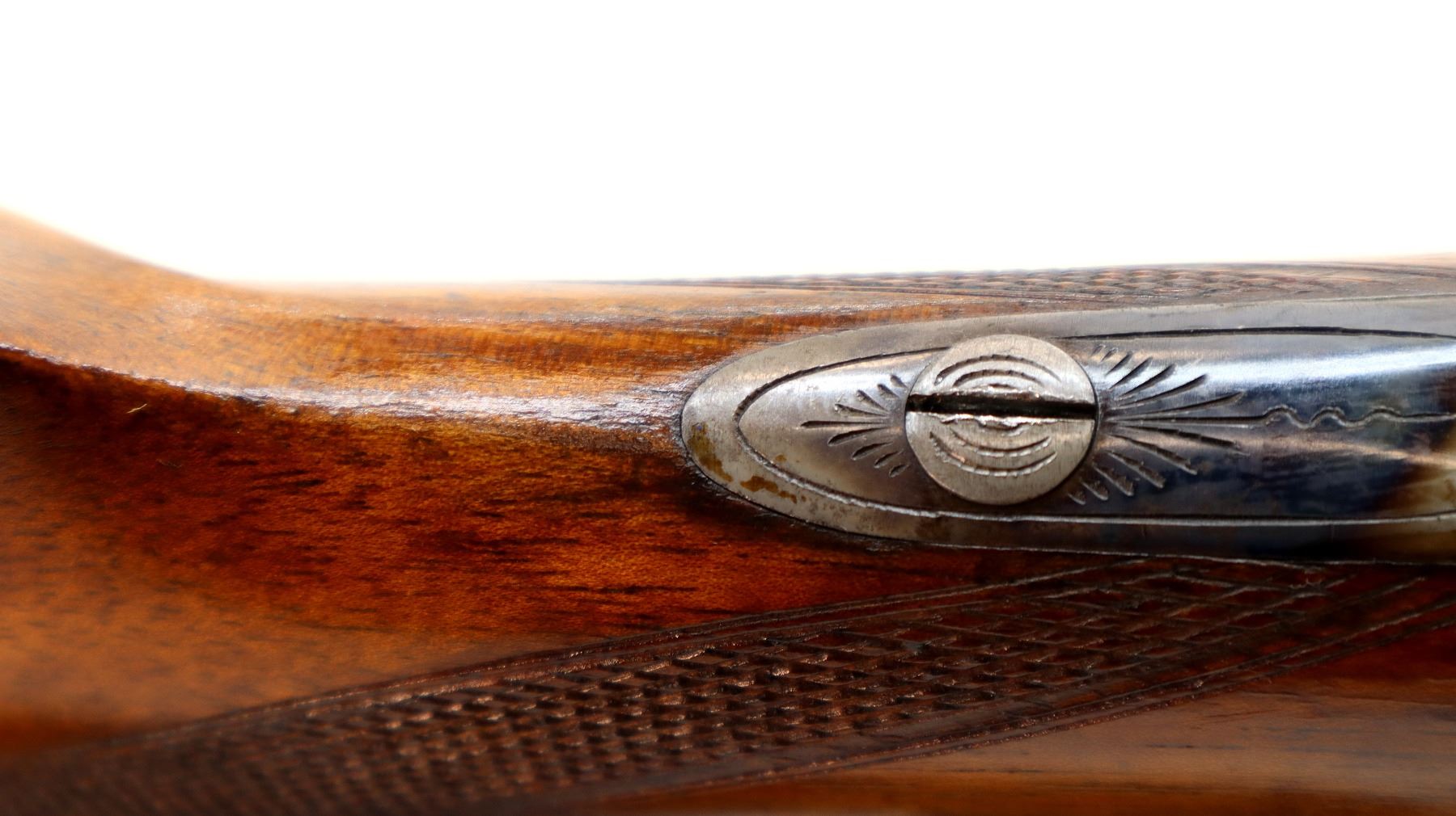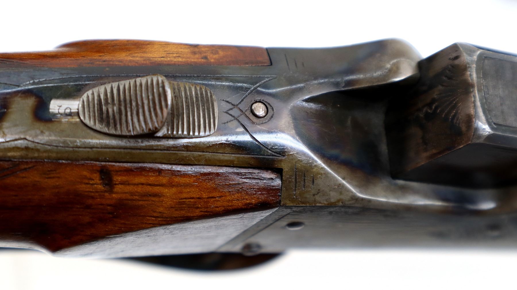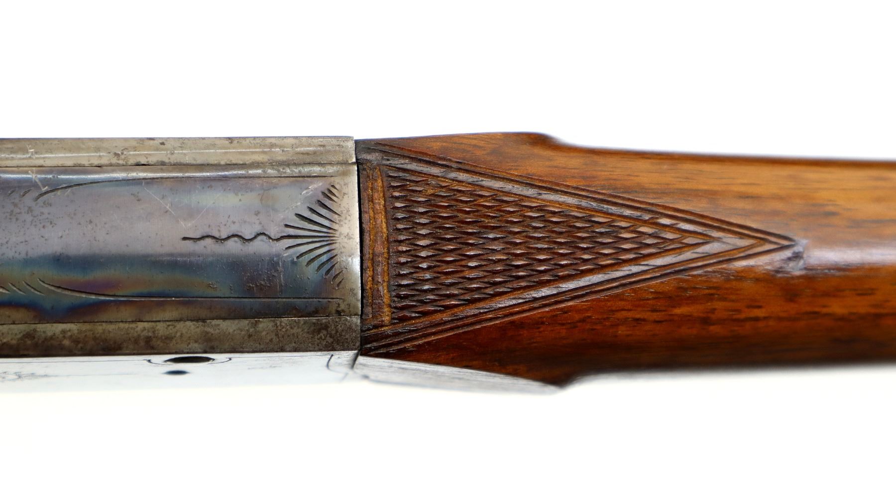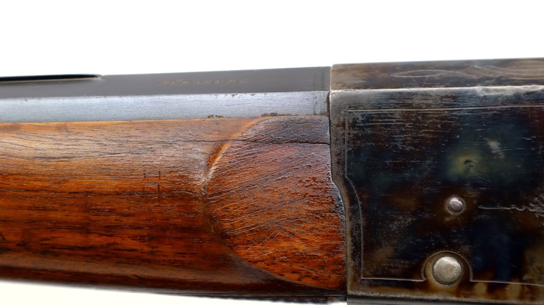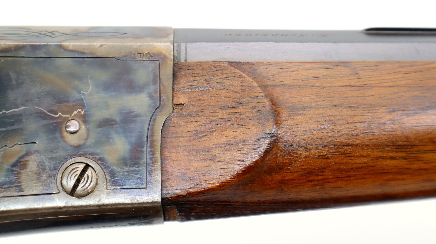 Main Description: Blade front sight with ramp, adjustable u notched rear sight, blued tapered octagon barrel, engraved colour case hardened receiver, manual safety, extractor is present, double set triggers, engraved, colour case hardened lever. Two piece wood stocks, Schnabel Forand tip, single forearm wedge, forearm is cracked on left and right sides, checkered pistol grip, European cheek rest, smooth steel butt plate, grip cap, sling swivels.