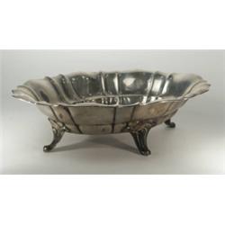 Ezüst, 580 g. Négy kifelé hajló lábon álló ovális forma karéjos díszítéssel. Jelzett: magyar, 1930-as évek, KM mesterjellel