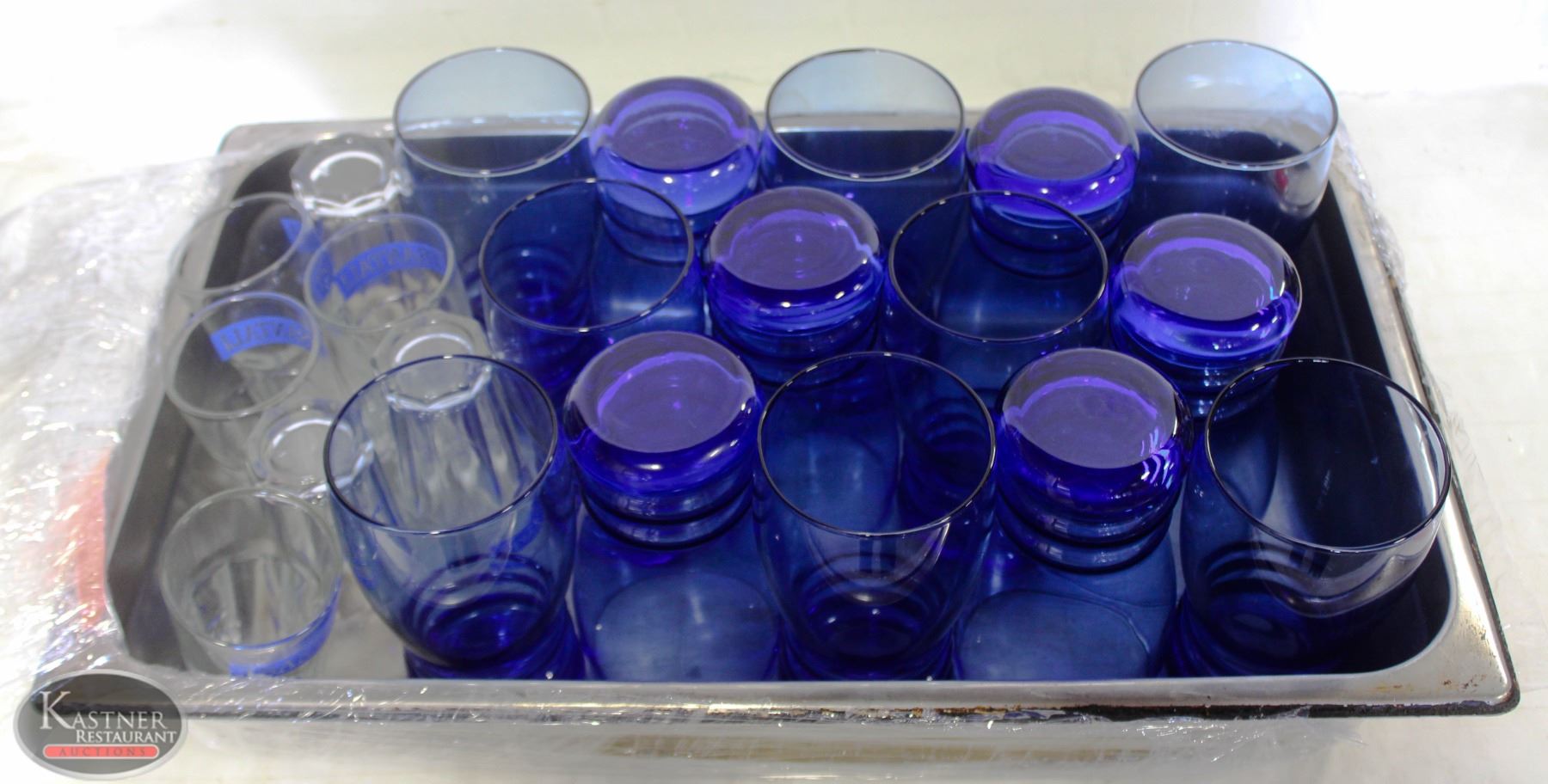 GLASSES. FULL SIZE STAINLESS STEEL TRAY WITH A ASSORTMENT OF GLASSWARE