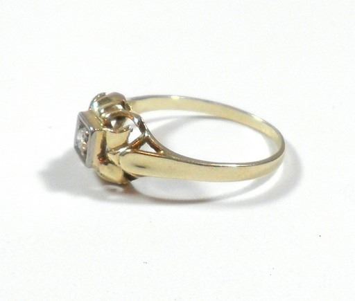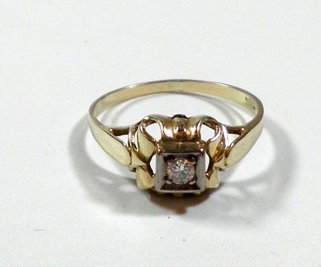 K14 gold ring set with an old faceted central diamond, estimated 10 dots, size 7, weight: 1.9 gm.