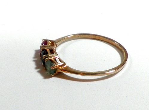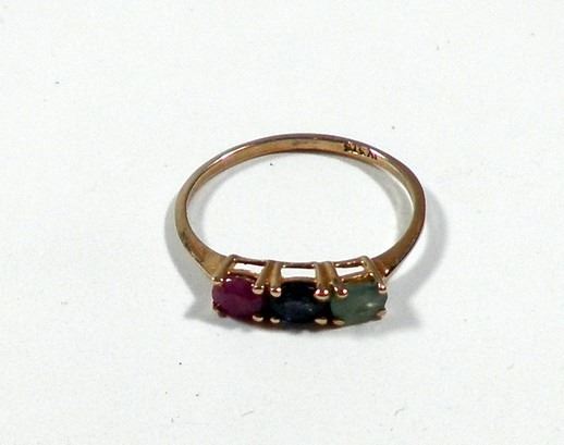 K9 gold ring set with ruby, sapphire and emerald, size 7, weight: 1.1 gm.