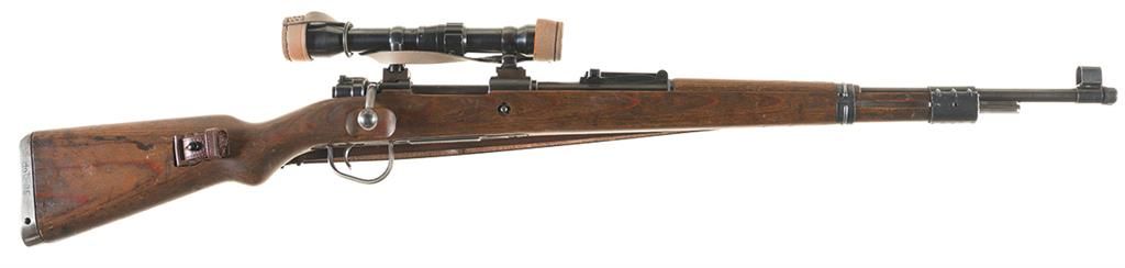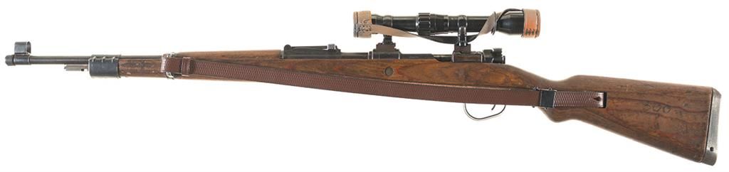 WWII Czechoslovakia K98 rifle that has been assembled to resemble a WWII German K98 objective mount sniper rifle. Equipped with an original post WWII "dow" sniper scope with the unique double front and rear claw scope mounts and the center elevation adjustment ring. With reproduction leather scope covers, a sheet metal front sight cover, and leather sling.