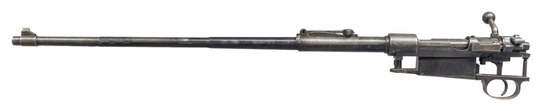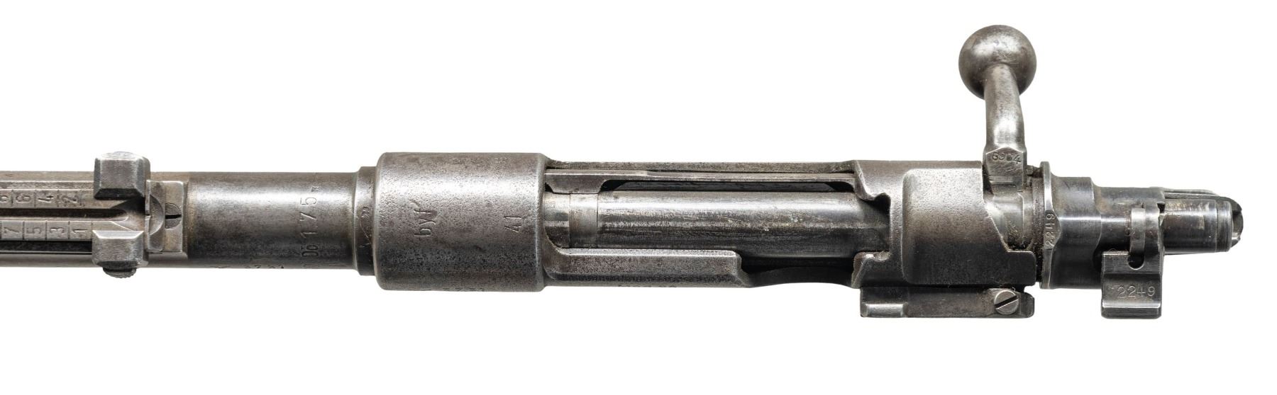 Cal. 3731ff. Bbl. 23 1/2". Standard K98k sights. Matching numbers on receiver, bbl. & front sight. Other parts appear to mostly WW2 German but have mixed numbers. BYF41 coded receiver with sights, bbl., floorplate, bolt assembly, bolt release, trigger, trigger guard, mag assembly & lock screws .No lock screws or other parts present. CONDITION: metal is mostly a dull gray color with scattered edge wear, dings oxidation & pitting. Action functions properly when hand cycled. Dark pitted bore with oxidation along its length & worn rifling. (25-2984/MJC). MODERN. $100-200.