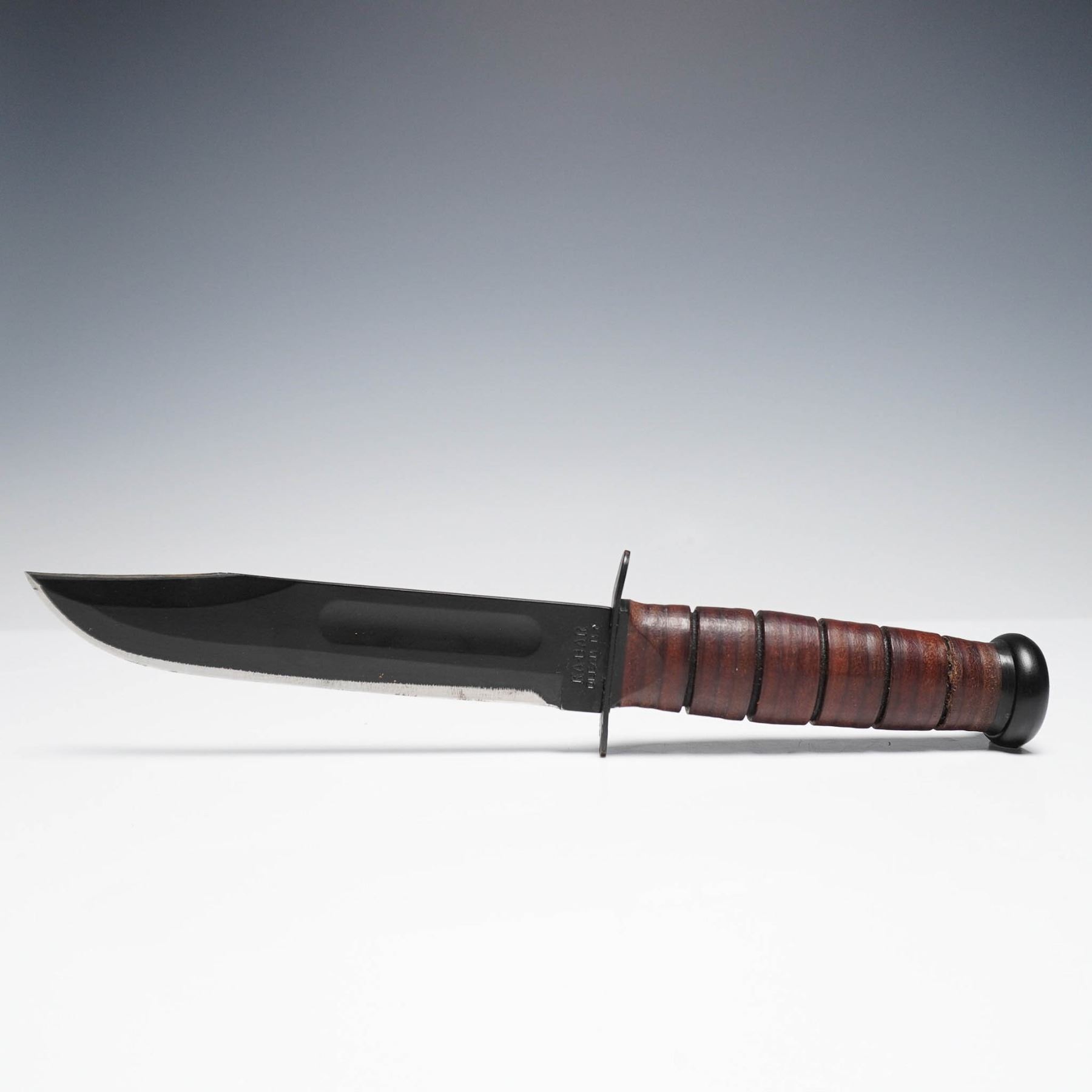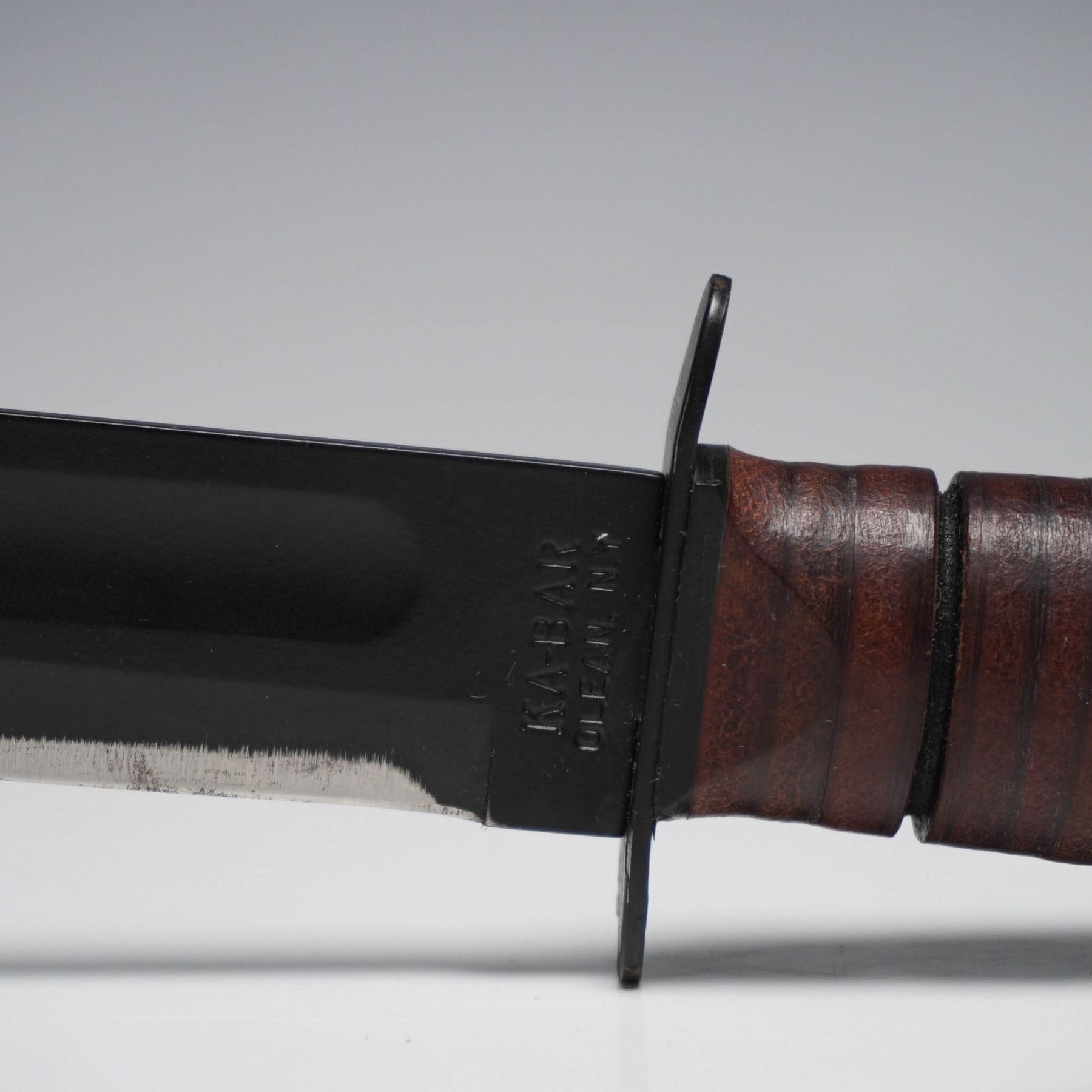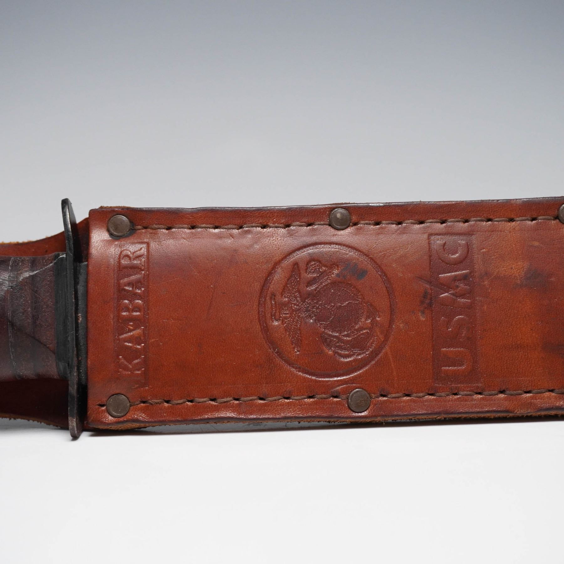 Vintage KA-BAR fixed-blade fighting knife, marked KA-BAR OLEAN, N.Y. and USMC on the blade, paired with its original brown leather sheath embossed with both KA-BAR and USMC logos. This iconic knife features a black blade and stacked leather washer handle, representing the traditional design used by the United States Marine Corps. A celebrated piece of American military history, ideal for collectors of military memorabilia or vintage knives.