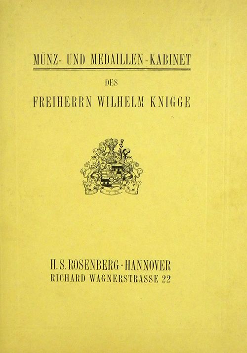 Rosenberg, H.S. MÜNZ- UND MEDAILLEN-KABINET DES FREIHERRN WILHELM KNIGGE. 1. & 2. ABTEILUNG: MÜNZEN UND MEDAILLEN VON BRAUNSCHWEIG-LÜNEBERG UND HANNOVER. Hannover, 9. Dezember 1929 and 8. Dezember 1930 und folgende Tage. Two volumes bound in one. 4to, later maroon cloth, gilt; original printed card covers bound in. (8), 110, (2); (6), (111)-236, (2) pages; 3941 lots; 51 fine plates. Both parts priced in pencil, with a few gaps. Fine. Scarce and important. Clain-Stefanelli 9313. Grierson 303.