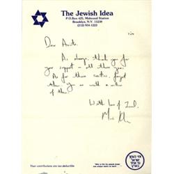 <b>1425. MEIR KAHANE</b> (1932 - 1991) Rabbi and leader of the Kach Parety, he wrote a weekly column for The Jewish Press which ran from 1961 until his assassination in 1991. A.L.S. "<i>M. Kahane</i>" on The Jewish Idea letterhead, 1p. 4to., Brooklyn, [n.d. but ca. June 18, 1971], to Anita Stark, in full: "<i>As always thank you for your support - all these years. As for those critics, forget them. You are worth a million of them</i>". With the original transmittal cover, which has been heavily docketed in another hand. Else very good condition.<b> $100-150</b>