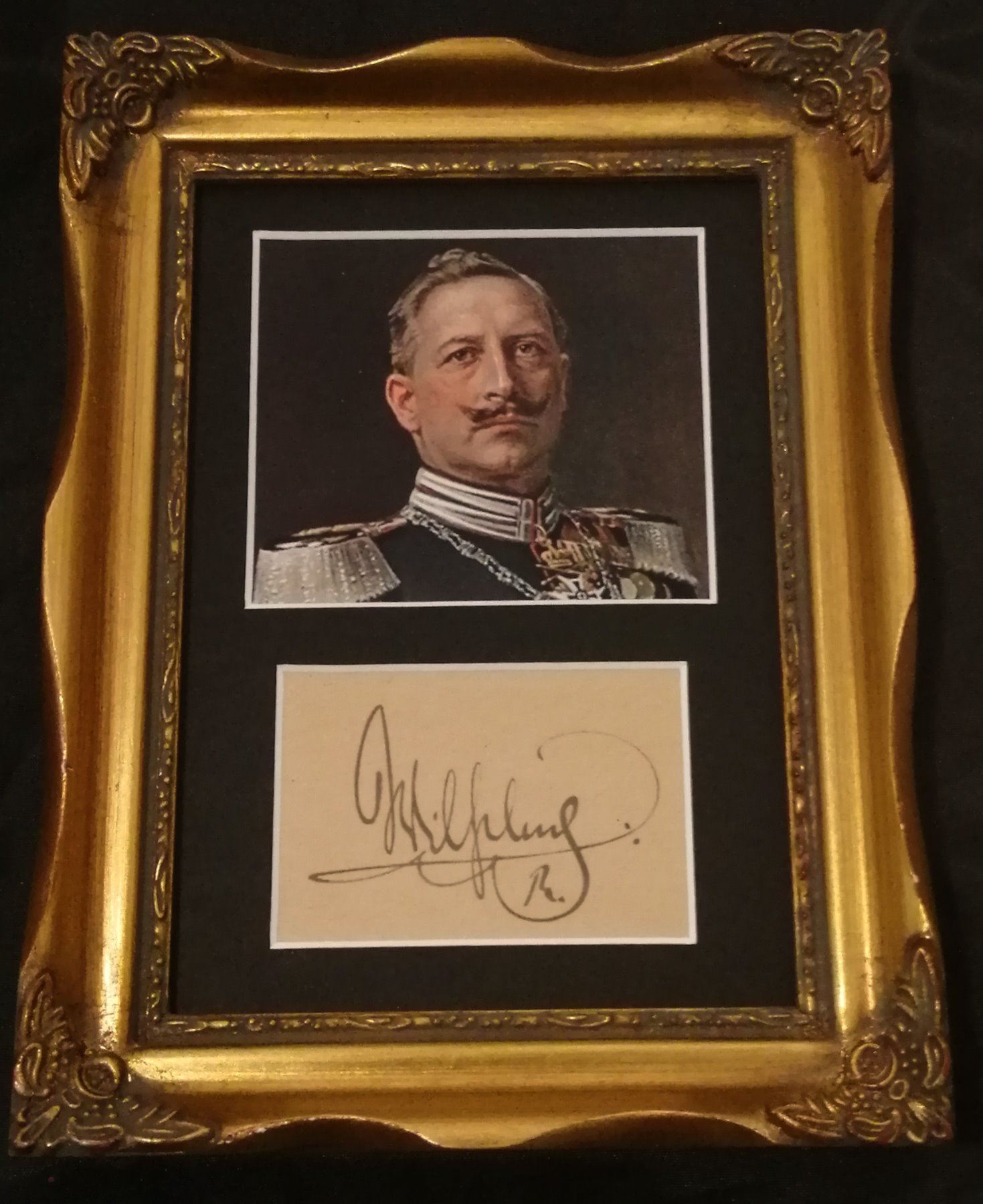 Wilhelm II (1859-1941), the German kaiser (emperor) and king of Prussia from 1888 to 1918, was one of the most recognizable public figures of World War I (1914-18). He gained a reputation as a swaggering militarist through his speeches and ill-advised newspaper interviews. While Wilhelm did not actively seek war, and tried to hold back his generals from mobilizing the German army in the summer of 1914, his verbal outbursts and his open enjoyment of the title of Supreme War Lord helped bolster the case of those who blamed him for the conflict. His role in the conduct of the war as well as his responsibility for its outbreak is still controversial. Some historians maintain that Wilhelm was controlled by his generals, while others argue that he retained considerable political power. In late 1918, he was forced to abdicate. He spent the rest of his life in exile in the Netherlands, where he died at age 82. Kaiser Wilhelm II autograph, mounted, framed in a gold style gilt frame, and supplied with coa.