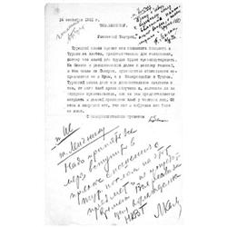(1883 - 1936) Soviet communist leader who had an active hand in establishing the Bolshevik government, , with Stalin and Zinovyev he led Russia following Lenin's death, executed by Stalin for his Trotskyite leanings. Lengthy A.E.S. at the bottom of a letter to him, 1p. 4to., [n.p.], Sep. 14, 1921, untranslated but with reference to the Turkish government's plans to export bread to ease the famine that had gripped the Soviet Union after World War I. Very good.