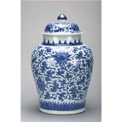 Massive, Chinese early Kang Hsi Period, blue and white porcelain jar and cover with all over scrolling lotus design (repair to section of mouth rim and finial of cover), late 16th Century; H: 23 3/4"