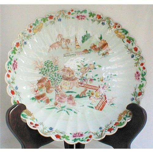 Fine period KANGXI 18th century chrysanthemum lobed charger. This is a particularly fine 12 1/2"(32cm) deep dish with elements of famille rose palette and delicate exquisite Kangxi polychromed details. A stunning plate, rendered to the Chinese taste.