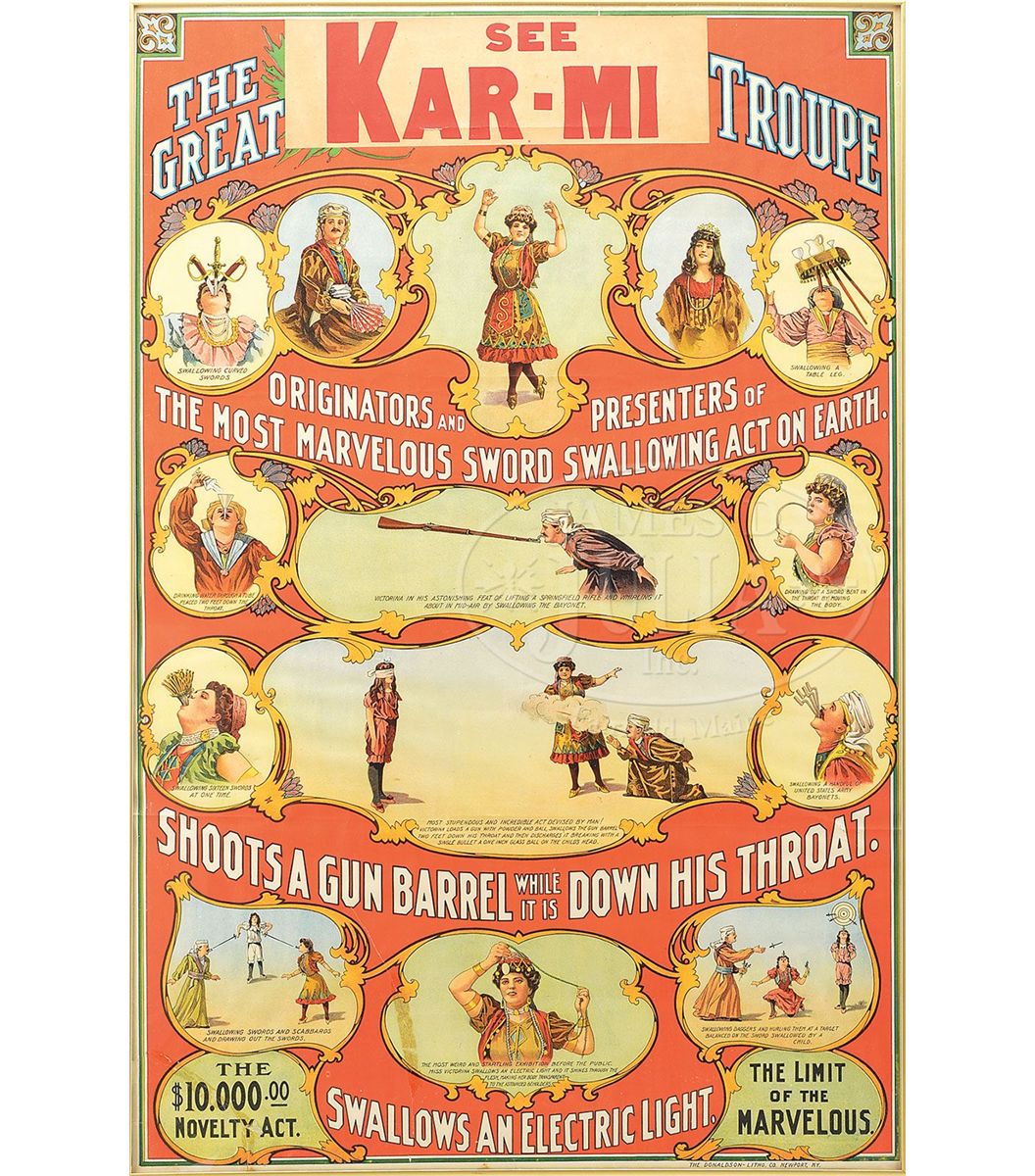 Colorful one-sheet stone litho with a variety of vignettes illustrating highlights of the performing troupe. The Donaldson-Litho. Co., Newport, Ky. SIZE: Sight size: 26-1/4" w x 40-1/2" t. CONDITION: Good to very good. There is a 9" vertical tear with tape residue at bottom; lower left corner torn and reattached with some tape residue. 1-13193