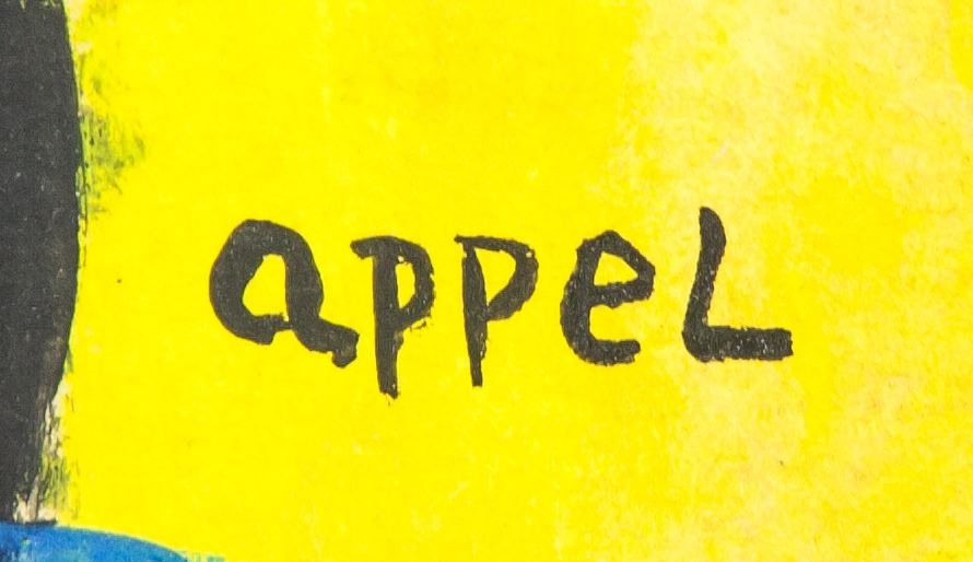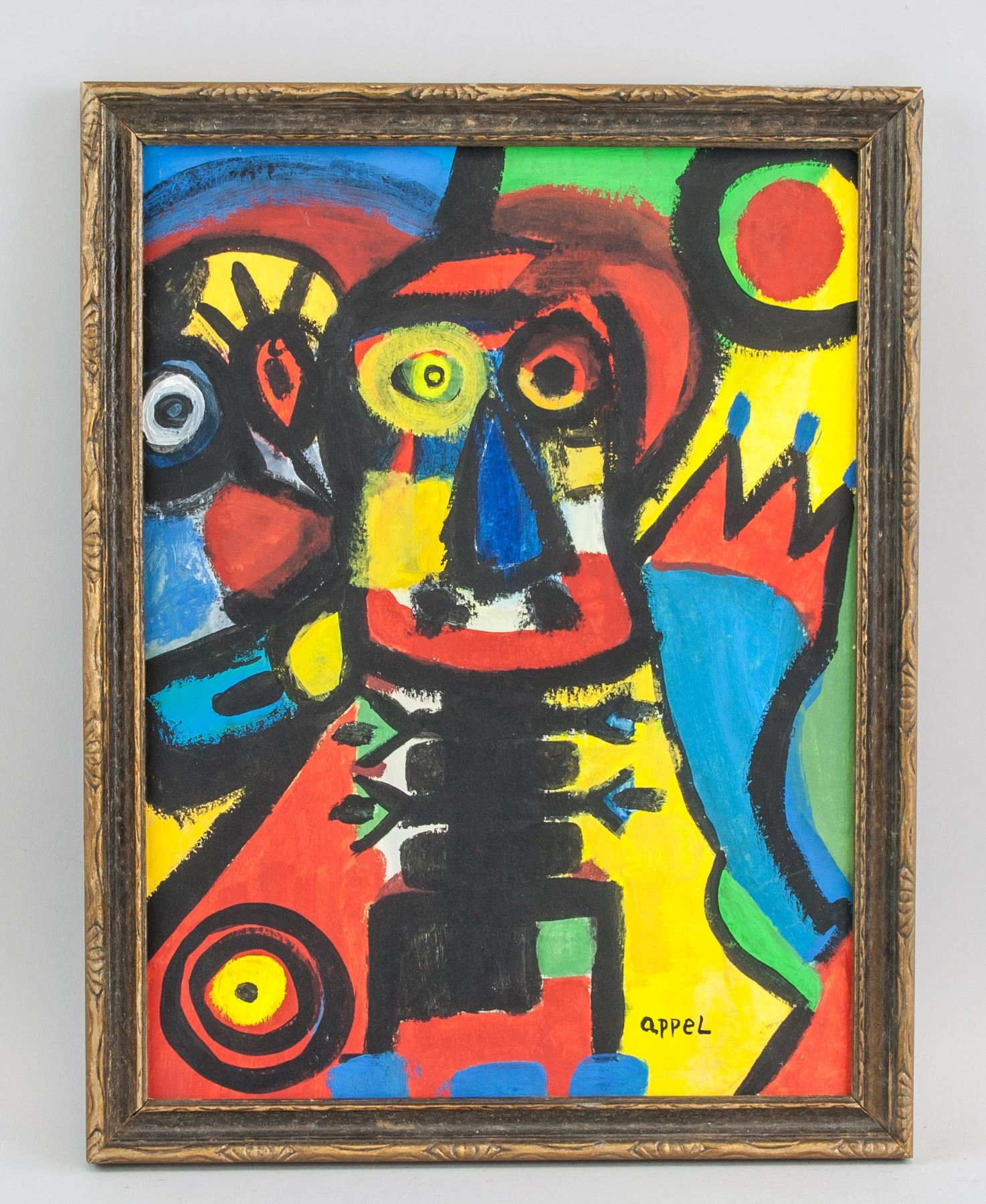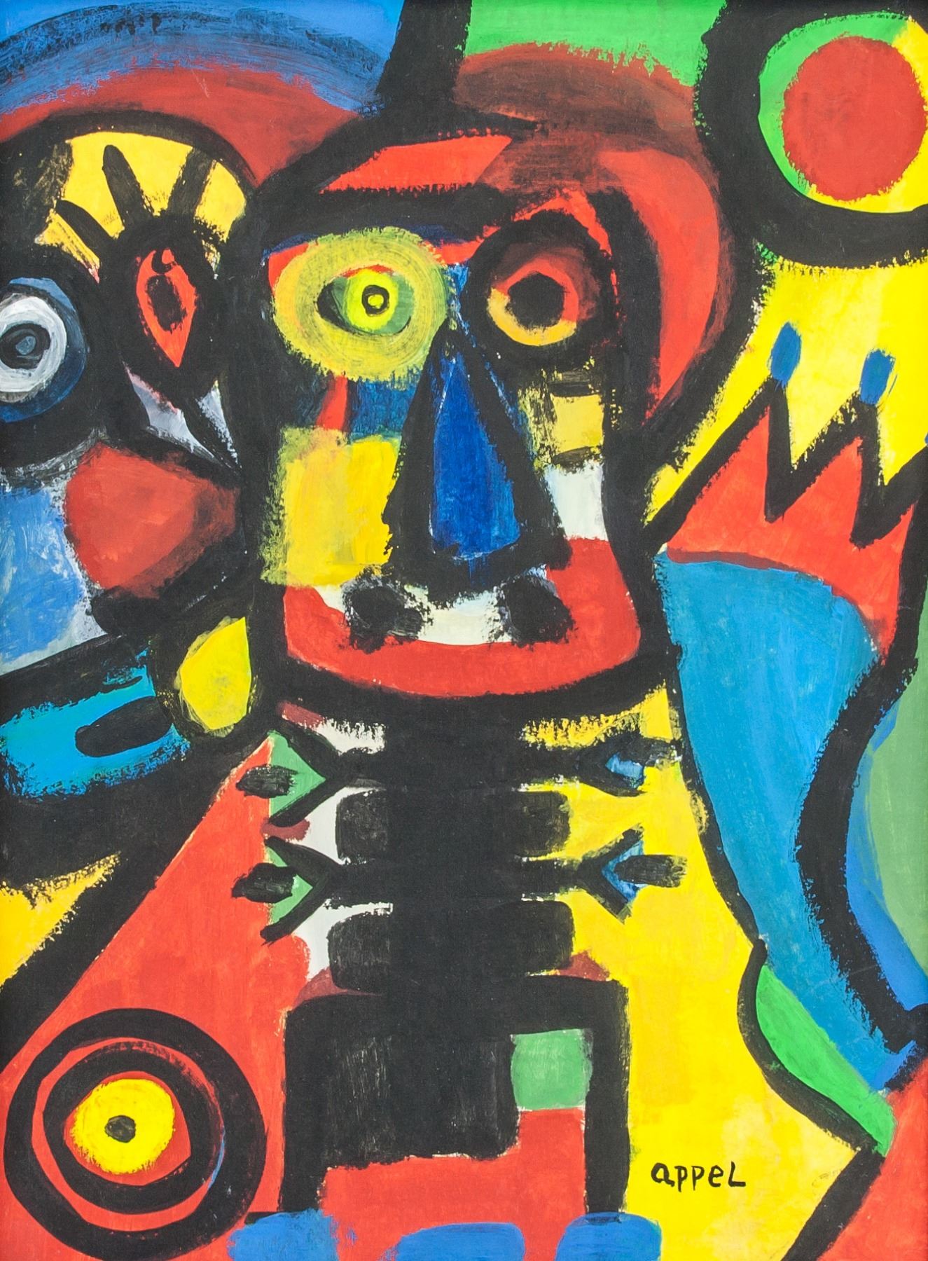 Gouache on paper abstract face. Signed and attr. Karel Appel (Dutch, 1921-2006). Signature on lower right corner. 11.8 x 8.9 in. (30 x 22.5 cm). A founder of the CoBrA association of painters, Karel Appel rendered expressionist canvases with vibrant color, violent brushwork, and thick application of impasto paint. The artist derived much inspiration from primitive art and children’s drawings, and was influenced by contemporaries such as Jean Dubuffet, the major exponent of Art Brut. Though Appel is primarily known for his paintings that combine elements of both figuration and of abstraction, the artist also experimented with relief paintings, sculpture, and design.