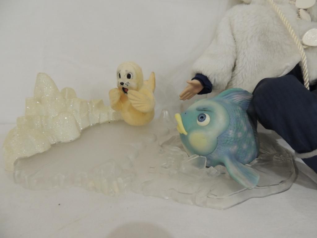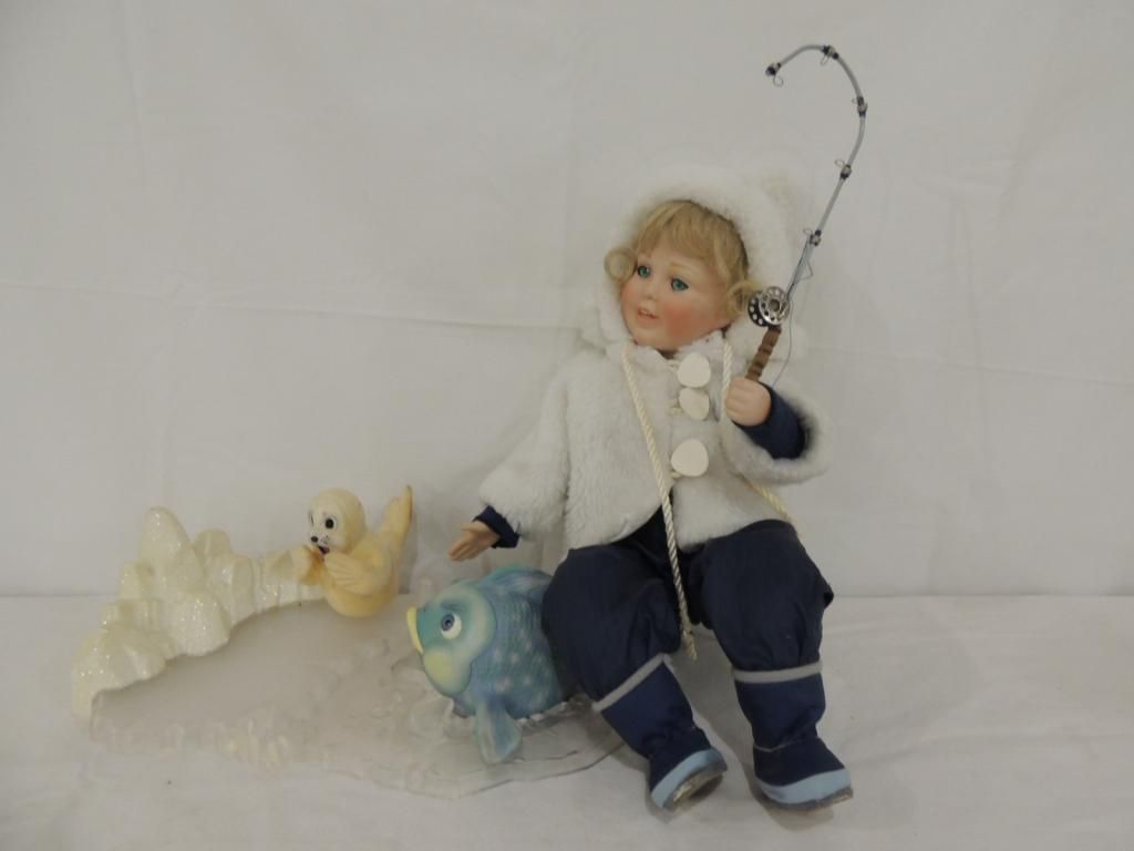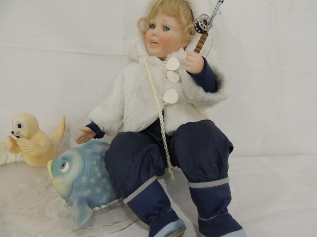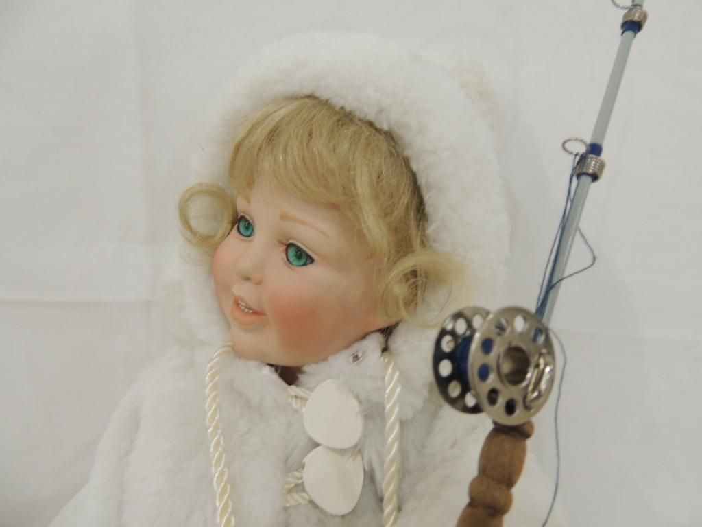 KAREN SCOTT PORCELAIN DOLL FISHING DOLL. WITH SNOW SUIT AND JACKET FISHING POLL AND FISHING FISH. AS SHOWN. SEE PHOTO FOR MORE DETAILS.