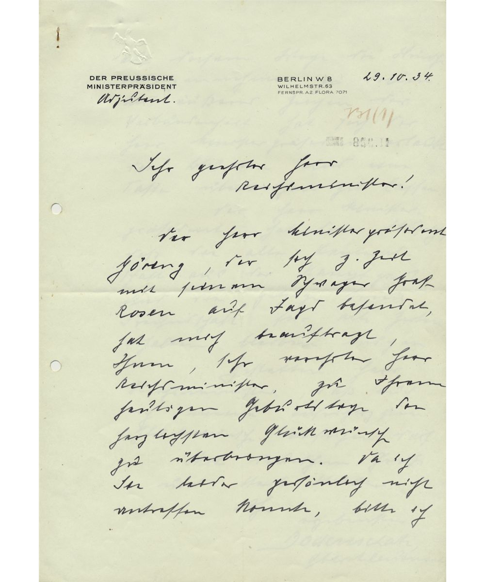 (1890 - 1979) German Luftwaffe minister and previously a member of von Richthofen's "Flying Circus", also served as Hitler's adjutant. Fine association A.L.S. as an oberstleutnant and Goering's Chief of Staff in the Prussian Ministry, 2pp. 4to., Berlin, June 1, 1934 to Minister of Propaganda JOSEPH GOEBBELS. Bodenschaft advises that he has been instructed to send along Goering's birthday greetings to Goebbels as Goering was visiting his brother-in-law, Swedish Count Eric von Rosen. File holes at left, docket and staple hole at top, else near fine.