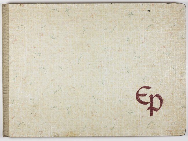 Photo album prepared on the occasion of Donitz's visit to a Kriegsmarine hospital. The 13 1/4" x 9 1/2" cloth-bound album bears initials "E P" on the cover. Within there are twenty-three 7" x 5" b/w photos showing Donitz being greeted by a senior officer before an honor guard, making the rounds of hospital beds with one sailor with an amputated leg shown nearby, others on crutches saluting the departing admiral, etc. At the rear of the album there are an additional 15 small photographs depicting patients in physical therapy and being observed and met by Donitz, the admiral and other officers strolling the grounds, an exterior view of the facility, etc. Thirty-eight photographs in all, set on pages with photo mounts. Very good.