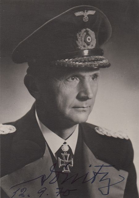 (1891 - 1980) German admiral who headed the U-Boat arm of the German Navy, later succeeded Hitler as Fuehrer after Hitler's suicide. S.P. 5" x 7" b/w, an image of the admiral showing him inuniform from chest, up, boldly signed and dated 1970. Fine.