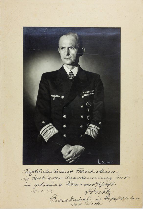 (1891 - 1980) German admiral who headed the U-Boat arm of the German Navy, later succeeded Hitler as Fuehrer after Hitler's suicide. AN INSCRIBED PHOTO TO A U-BOAT CAPTAIN Fine association war-date I.S.P., 12" x 17 1/2" (overall) b/w, a half-length standing pose in uniform inscribed on the lower mount: "Kapitanleutnant Frauenheim in thankful recognition and in loyal comradery. Donitz Vizeadmiral and Commander of U-Boats 10-2-42". Slight foxing to the mount, else fine. U-boat captain FRITZ FRAUENHEIM (1912-1969) sank a total of 19 vessels of 78,853 GRT total from September 1939 until his retirement from front line service in December 1940. He was awarded the Knights Cross for his service. Frauenheim would also command the 23rd and 29th U-boat flotillas in the Mediterranean.