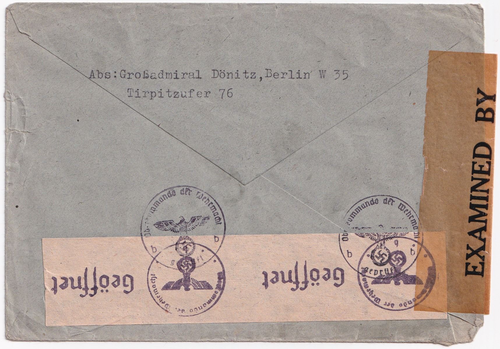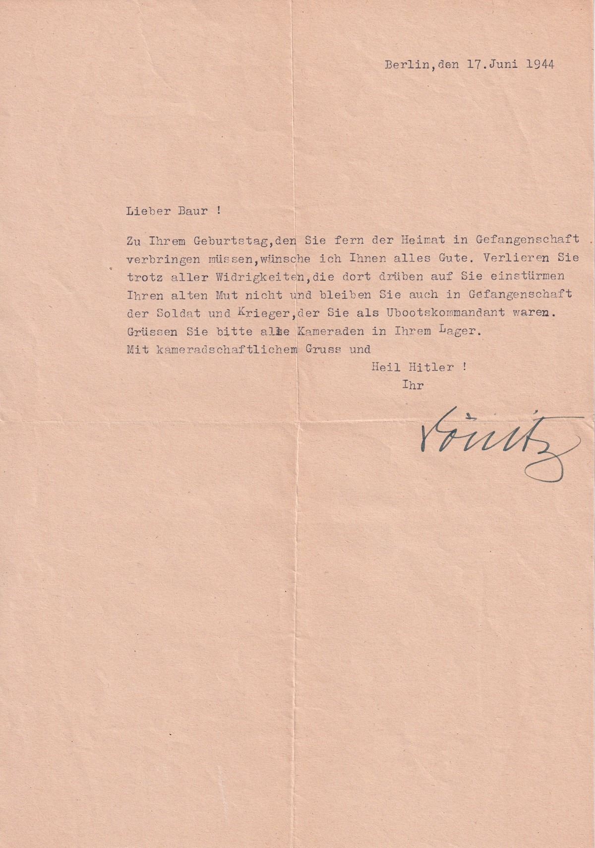 (1891-1980) German Grand Admiral and Supreme Commander of the German Navy, he briefly succeeded Hitler as Reichspresident and Supreme Commander of the Wehrmacht until Mai 23, when he was arrested. Extremely rare war date letter personally sent by Donitz to U-Boat Kapitanleutnant Goetz Baur, at the time a Prisoner of War in Canada, who commanded the German submarine U-660 in 3 patrols and sinking 2 ships. Goetz was forced to scuttle his submarine in the Mediterranean after sustaining damage by depth charges from HMS Lotus and HMS Starwort November 12, 1942, but saved his entire crew. Typed letter signed, no official letterhead, Berlin, dated 17. June 1944, reads: 'Dear Baur! On your birthday, which you have to spend in captivity far from home, I wish you all the best. Despite all the adversities that besiege you over there, don't lose your courage and remain the soldier and warrior that you were as a submarine commander despite being a prisoner. Please greet all comrades in your camp. With comradely greetings and Heil Hitler! Your, Donitz' Boldly signed in black ink at conclusion by Donitz. WITH: The original transmittal envelope addressed 'Kriegsgefangenenpost Oberleutnant zur See Goetz Baur England / Camp 4 Nr. 59 933.' The address was corrected to Canada in red pencil. The return address reads 'Abs: Grossadmiral Donitz, Berlin, W 35 Tirpitzufer 76.' Censorship labels by the German Oberkommando der Wehrmacht and the foreign examiner.