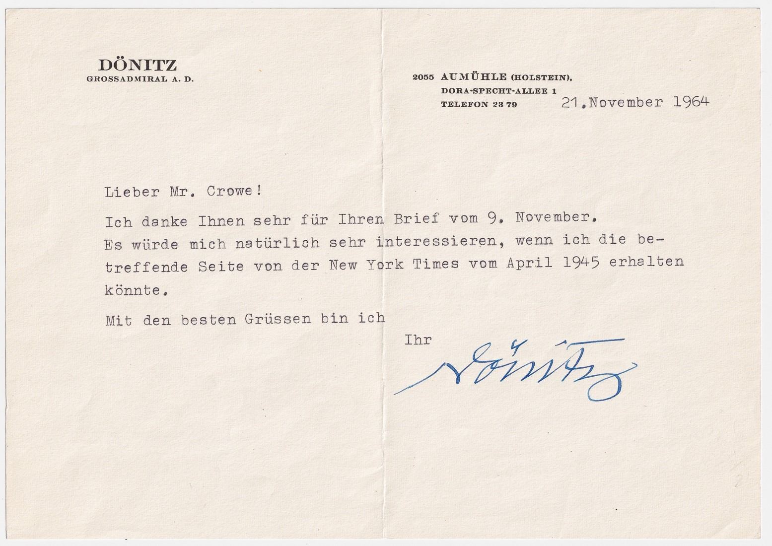(1891-1980) German Grand Admiral and Supreme Commander of the German Navy. Typed Letter signed in blue ink on his personal letterhead, 1 page, 8.25 x 5.75 inches, Aumuhle, 21. November, 1964, in part: 'Dear Mr. Crowe! Thank you for your letter from 9. November. I would be very interested to receive the April 1945 page from the New York Times...'. One fold, fine.