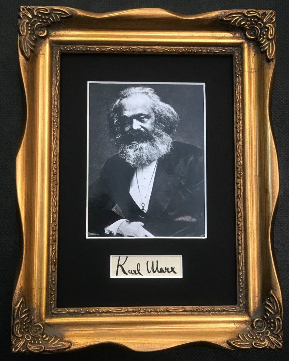Karl Marx was a German philosopher, economist, historian, sociologist, political theorist, journalist and socialist revolutionary. Born in Trier, Germany, Marx studied law and philosophy at university. He married Jenny von Westphalen in 1843. A signature cutting from the German, mounted and professionally framed in a gold coloured antique style frame. Supplied with coa.