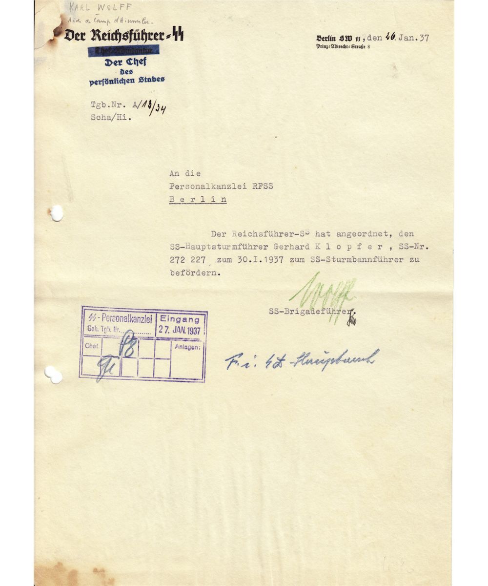 (1906-1975) Colonel-general in the Waffen-SS, liason officer for Himmler with Hitler, German military governor of Northern Italy. Fine association T.L.S. in green indelible pencil on Reichsfuhrer-SS letterhead, 1p. large 4to., Berlin, ca. Jan. 27, 1937 officially advising that SS-Hauptsturmfuhrer Gerhard Klopfer has been promoted to the rank of sturmbannfuhrer. File holes at left, left corners slightly browned, else very good. GERHARD KLOPFER (1905-1987) was an SS officer, member of the Gestapo, served as Martin Bormann's assistant in the Party Chancellery, and represented Bormann at the Wannsee Conference. In 1938, he became responsible for the seizing of Jewish businesses and for questions about mixed marriages.