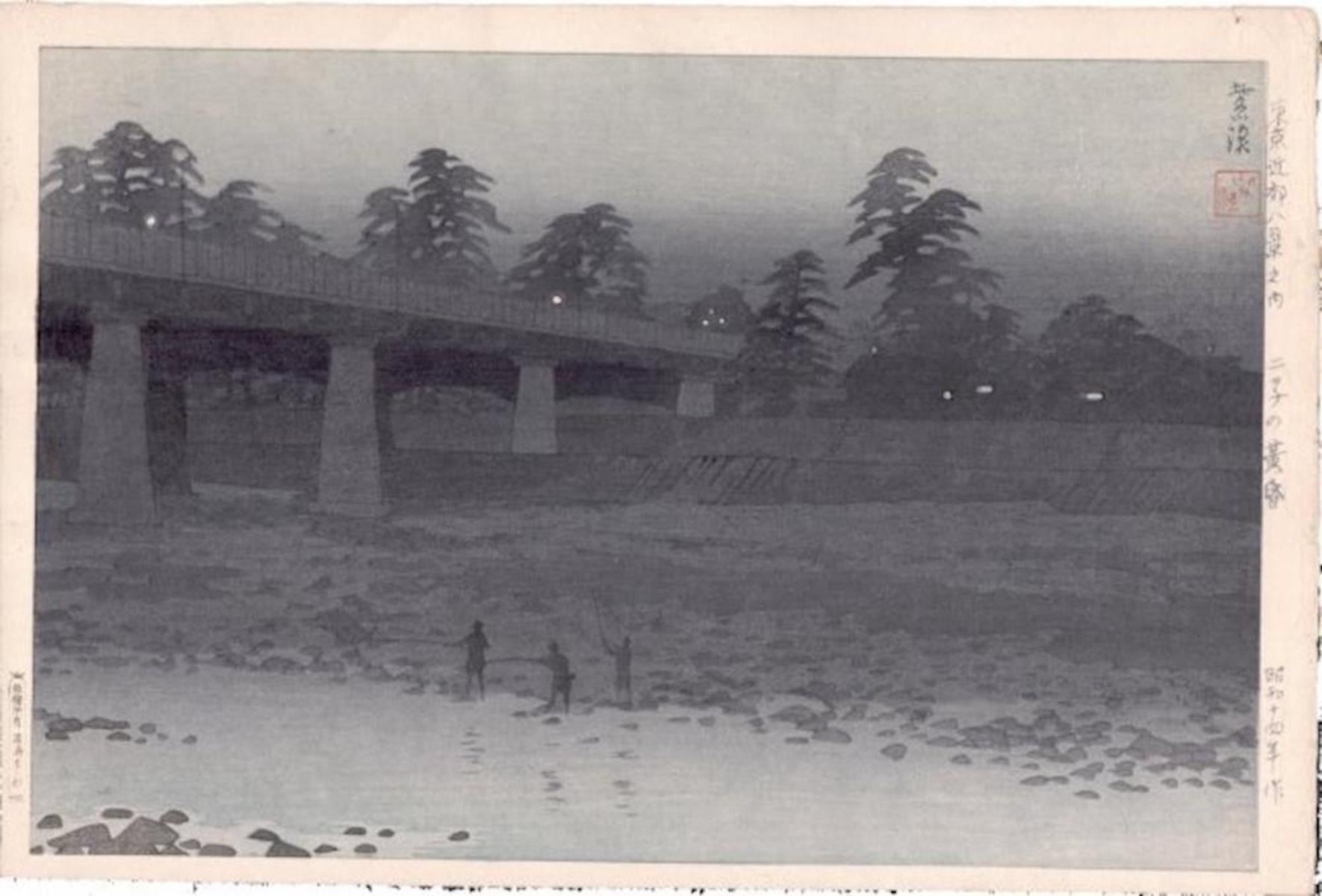 KASAMATSU SHIRO " DUSK AT FUTAGO".1939. OBAN YOKO-E. SERIES: 8 VIEWS OF THE SUBURBS OF TOKYO. PUBLISHIER: SHOZABURO WATANABE. COPYRIGHT SEAL OF WATANABE ON LOWER RIGHT MARGIN.