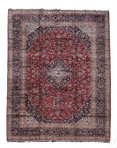 KASHAN ORIENTAL ROOM SIZE CARPET. Last half of the 20th C. Center medallion with all over floral motif on red background. Colors of red, blur, ivory and gold. SIZE: 99in. x 138in.. CONDITION: Very good. 9-26382