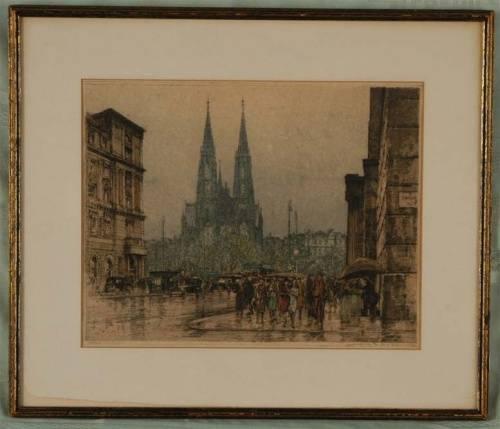 KASIMIR STYLE COLORED ETCHING 10 5/8"x14", pencil signed ind European Street Scene, light toning estimate 200-300