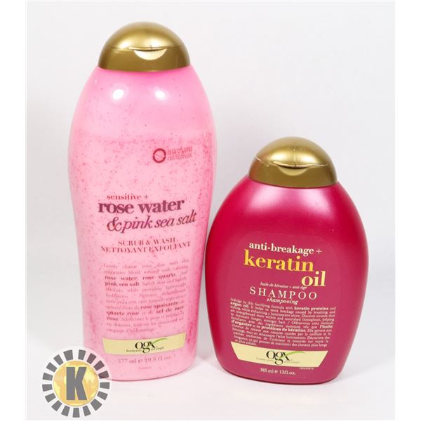 LOT OF OGX KERATIN OIL SHAMPOO AND ROSEWATER SCRUB