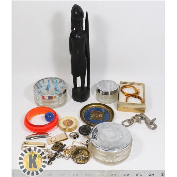 CARVED FIGURE, TRINKET BOXES, TIE BAR, AND MUCH MORE***ITEM(S) LOCATED IN LETHBRIDGE ALBERTA (PLEASE READ AUCTION DETAILS FOR INFORMATION ON TRANSPOR