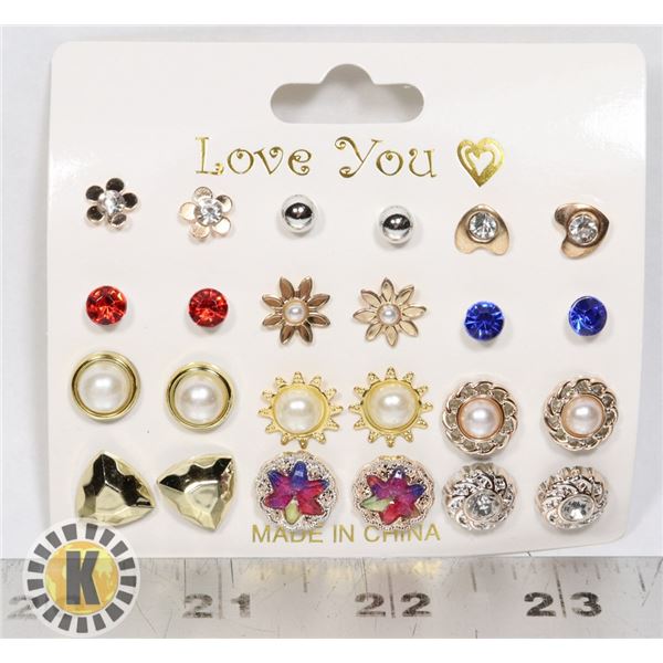 NEW 12PC STUD EARRING SET INCLUDES HEARTS+FLOWERS