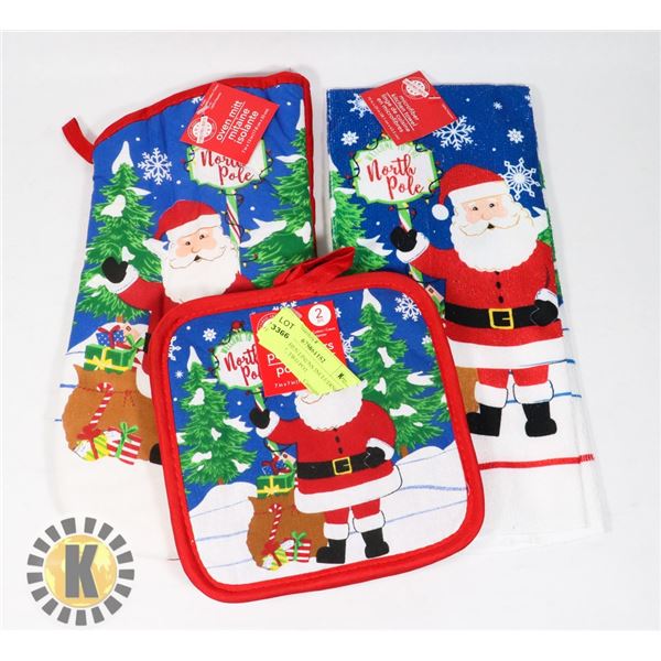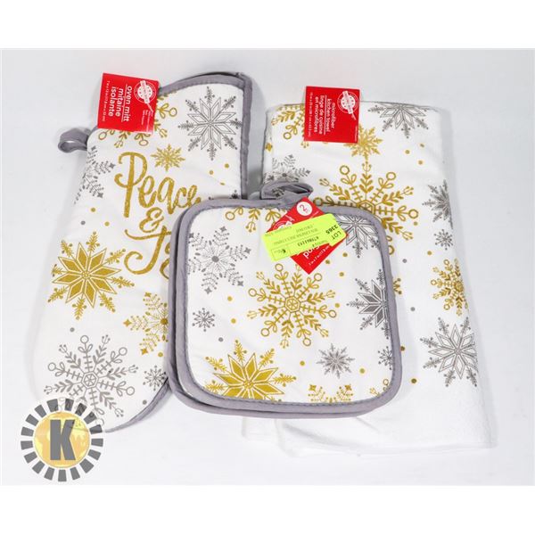 NEW KITCHEN LINENS INCLUDING OVEN MITT, TWO POT