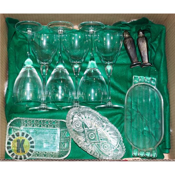 FLAT OF DISHWARE INCLUDING CUT GLASS, SILVER PLATED