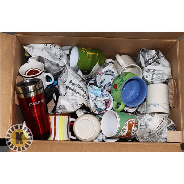 BOX OF ASSORTED COFFEE CUPS AND TRAVEL MUGS