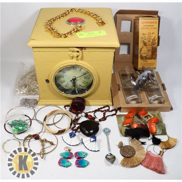 VINTAGE JEWELRY CLOCK BOX WITH ASSORTED ITEMS
