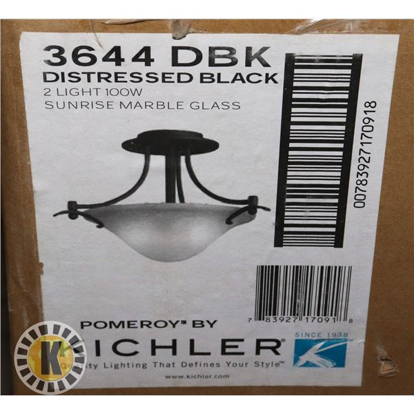 KICHLER LIGHTING POMEROY 2 LIGHT-SEMI FLUSH IN DISTRESSED BLACK 3644 DBK***ITEM(S) LOCATED IN LETHBRIDGE ALBERTA