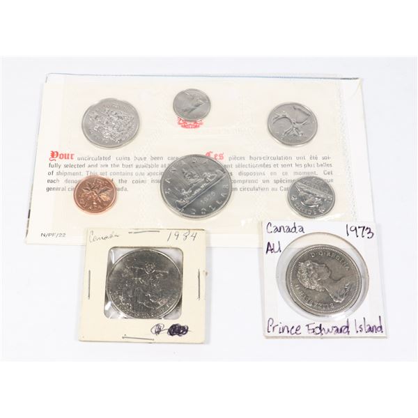 1984 CANADIAN $1 JACQUES CARTER 1973 CANADIAN $1 PRINCE EDWARD ISLAND 1975 6 CANADIAN COINS UNCIRCULATED WITH PROOF***ITEM(S) LOCATED IN LETHBRIDGE A