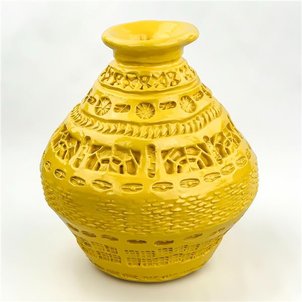 #9013 - YELLOW TEXTURED CLAY POTTERY VASE, SIGNED BREE A. ON THE BOTTOM, BOTTOM HAS A CLAY SPLIT FROM WHEN IT WAS MADE… THEN DRIED. WILL NE