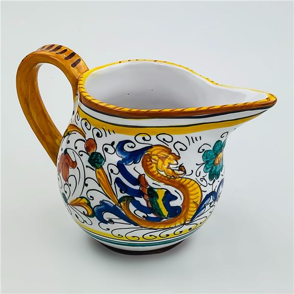 #9015 - ITALIAN DERUTA POTTERY HAND PAINTED CREAMER - RAFFAELLESCO DECORATION - DRAGON, SIGNED ASSISI JUST BELOW THE RIM OF THE CREAMER AND DERUTA
